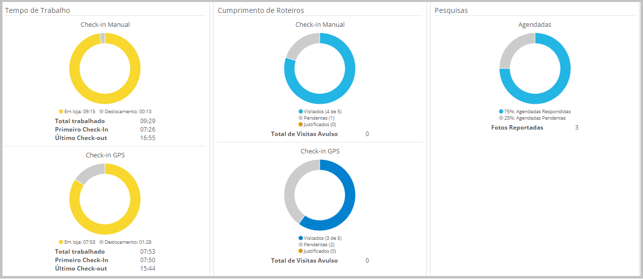 Similarly, the Itinerary Compliance chart compares the total number of visits to points of sale - with statistics of visited, pending and justified POS - reported by the manual check-in and the one reported by the GPS of the device.