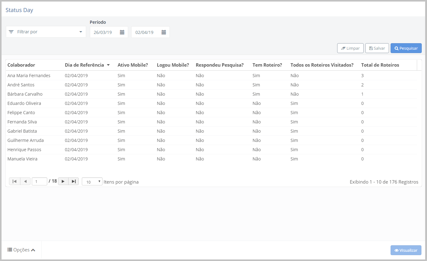 One of the many tools for auditing and monitoring your operation offered by Involves Stage is the Status Day feature. On this page, it is possible to monitor the field employees´ activity panel, which is constantly updated with statistics and graphs of their daily routine, in addition to generating consolidated reports of the operation.