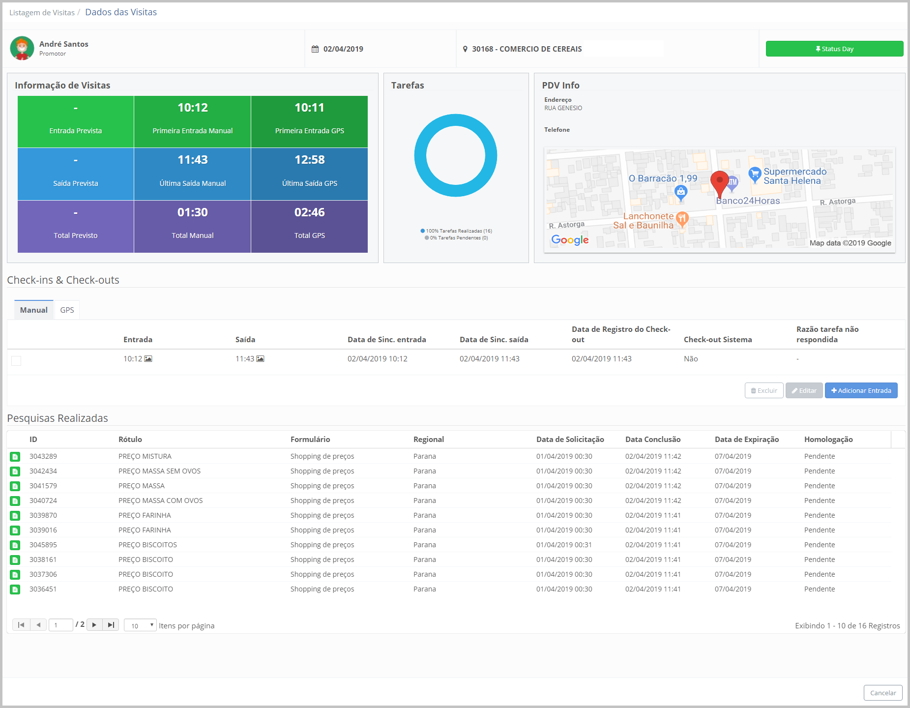 You will be taken to the Visit Data page, with information only for the selected point of sale. Planned and completed check-in and check-out data, total tasks carried out, point of sale information, and answered surveys are presented. On this page you can even register the employee's entry and exit at the point of sale for registration purposes. However, the system does not accept the registration for visits that can still be made.