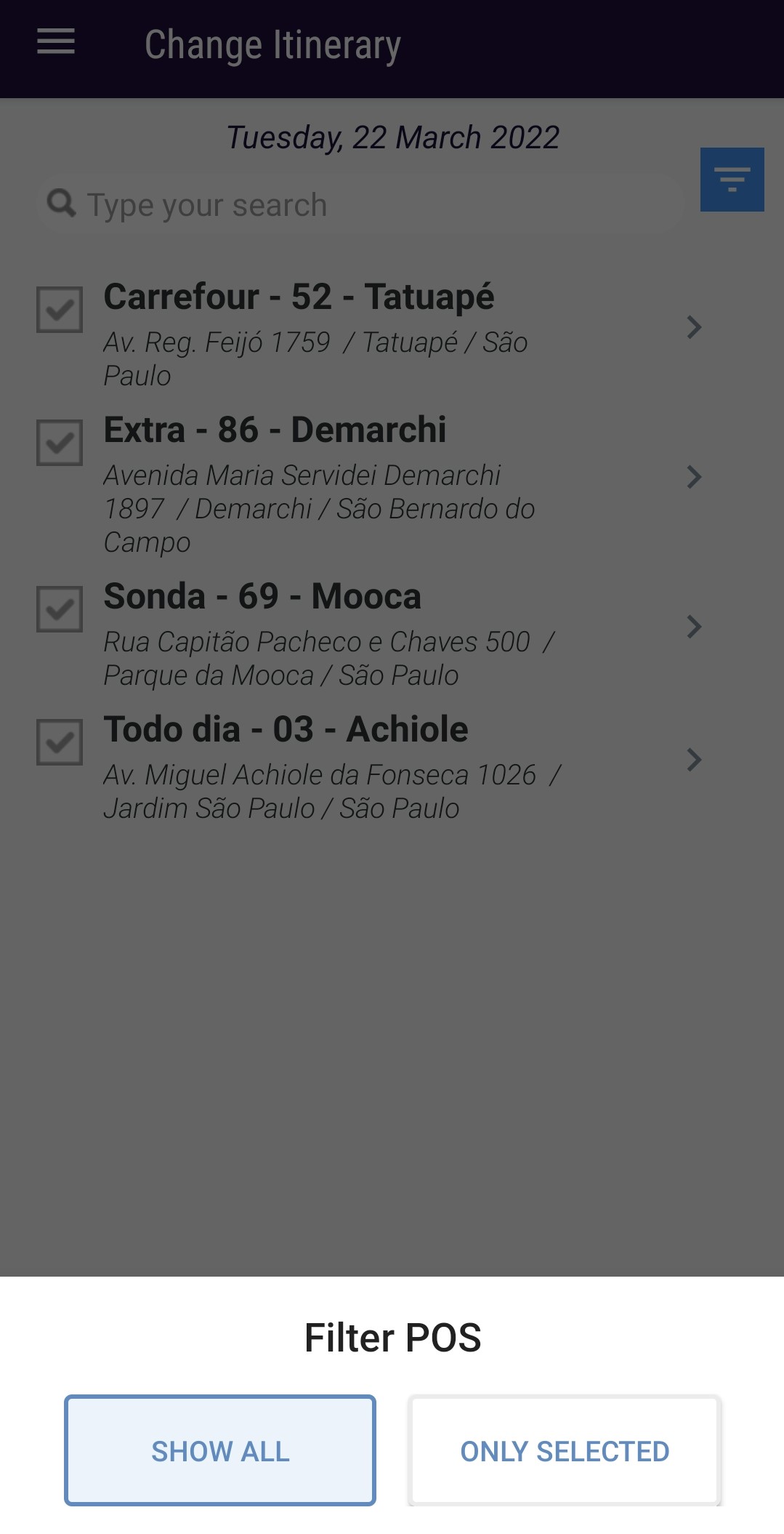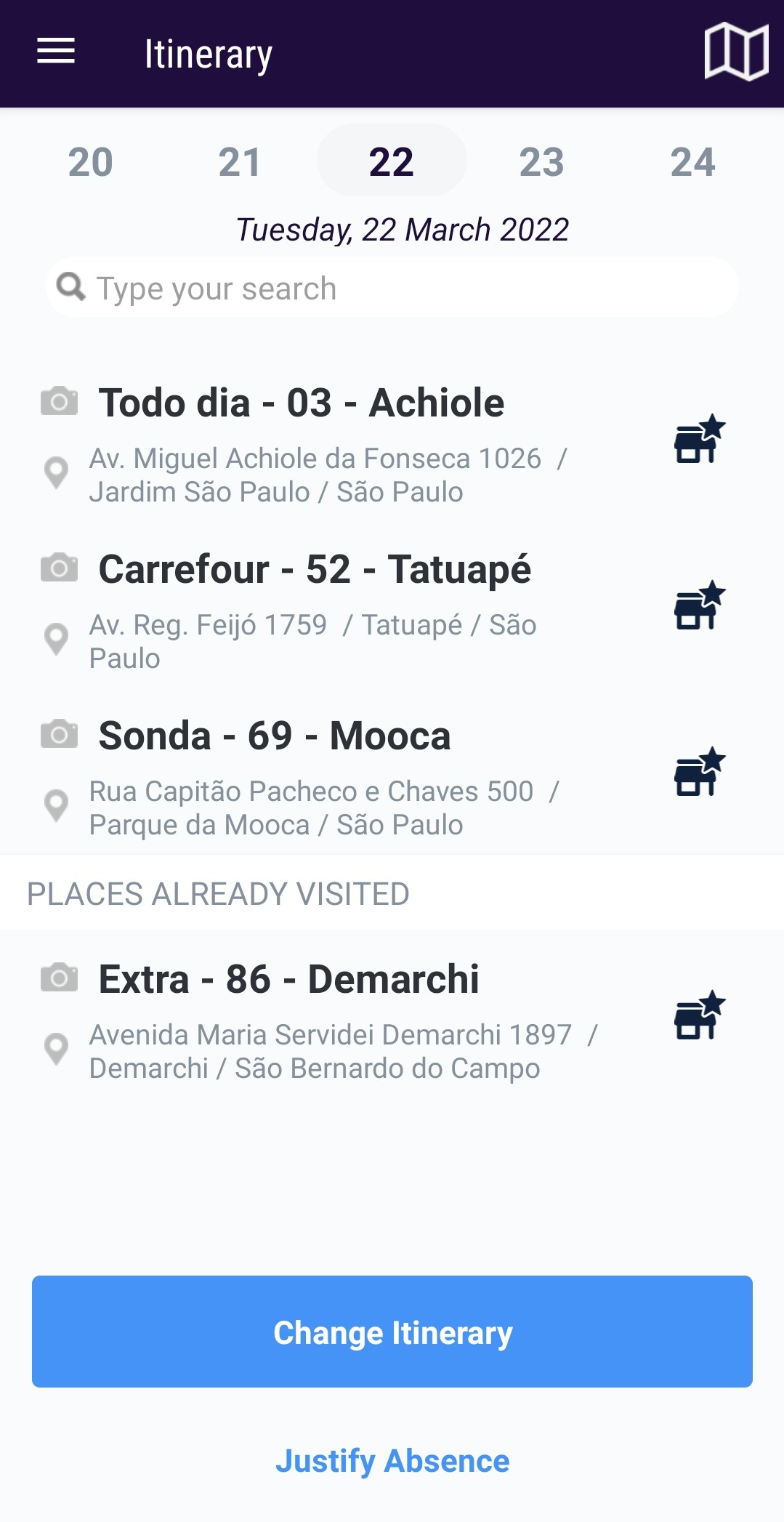 In it you can search for the point of sale and easily include it in your current or future date itinerary, all you need is an internet connection. To access it, click on the Itinerary option on the Menu. Below the list of points of sale, click on the Change itinerary button.