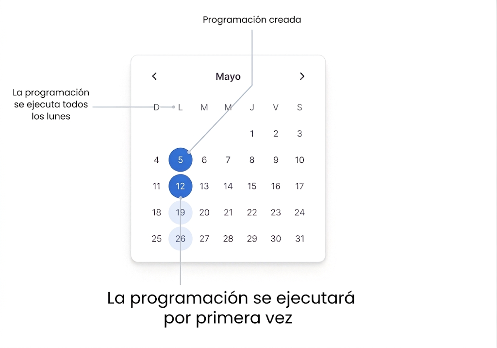 Día de la semana: Lunes (cada lunes se ejecuta una nueva programación o ciclo)