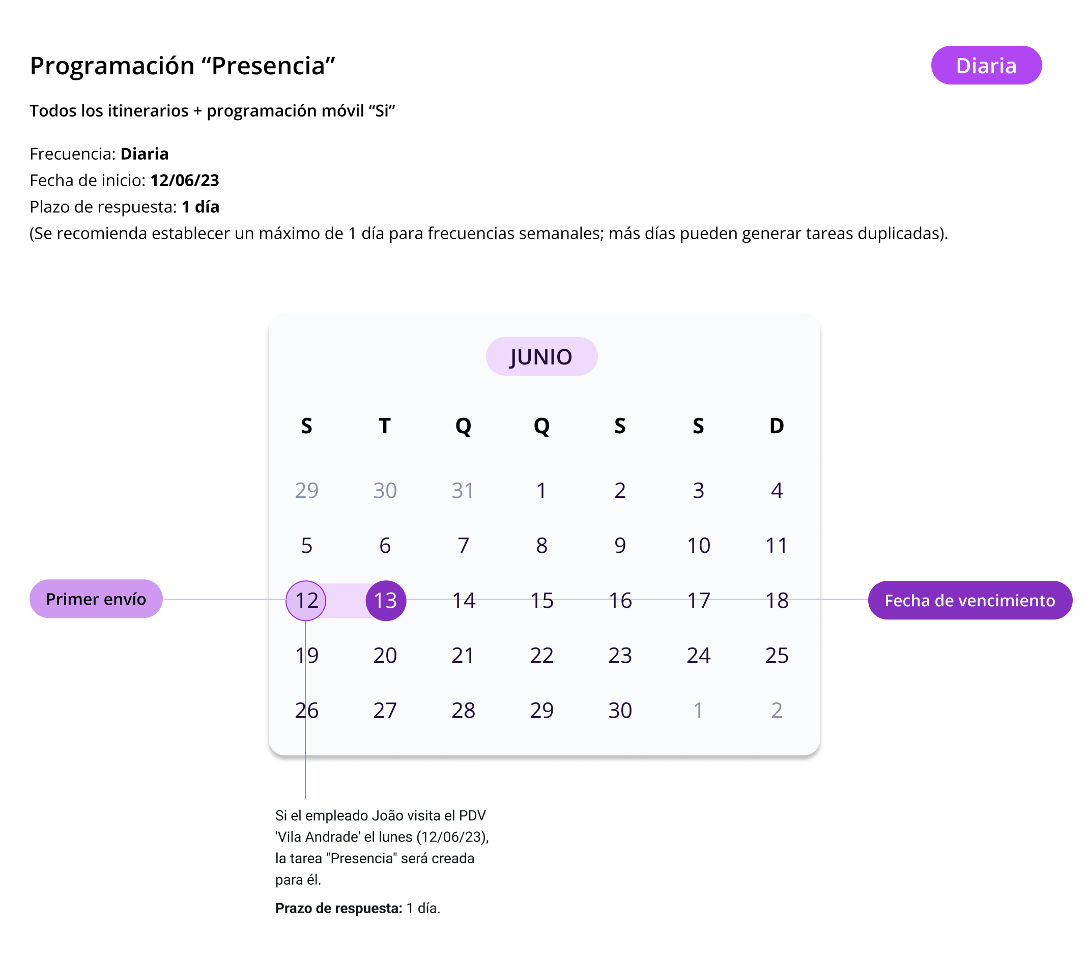 Diariamente: Las tareas se crean a partir del check-in, y se generarán una vez al día por punto de venta y empleado, ejemplo: