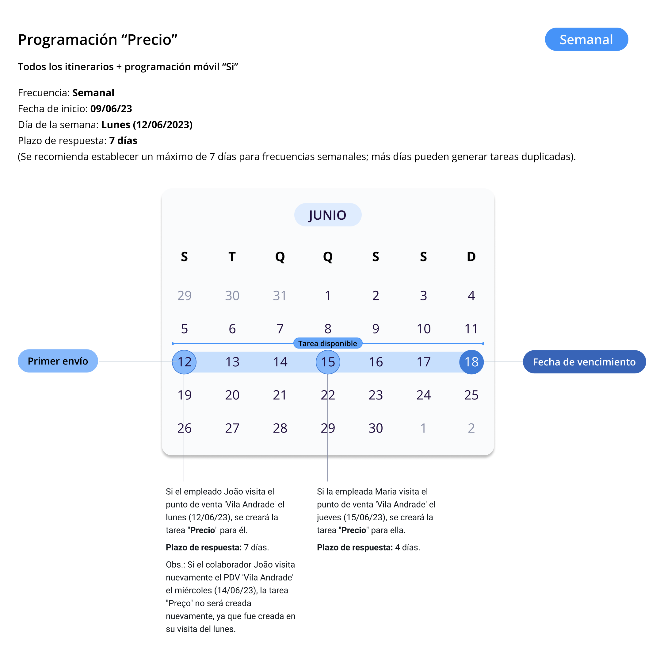 Semanalmente: Las tareas se crean a partir del check-in, y se generarán una vez a la semana por punto de venta y empleado, ejemplo: