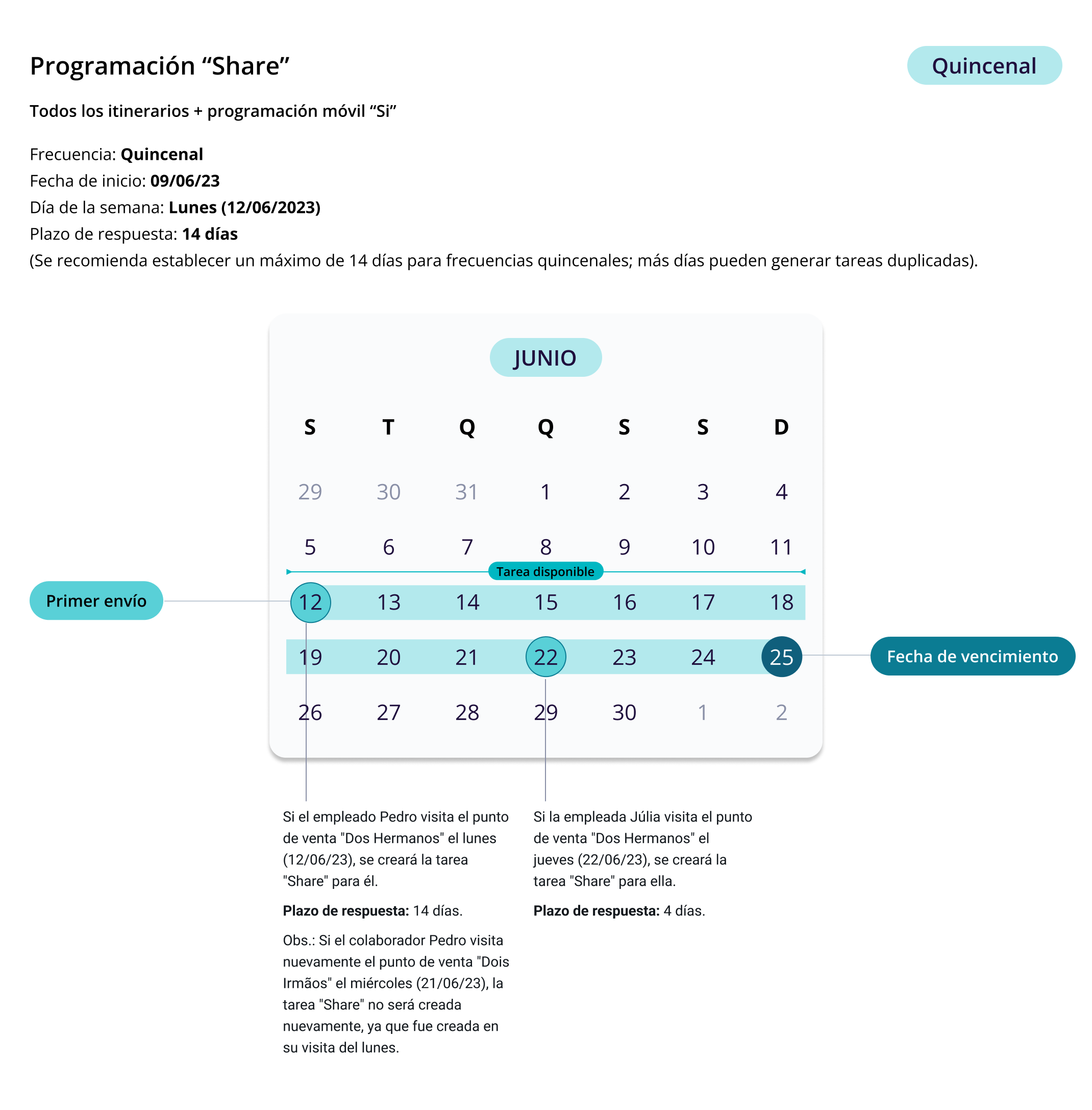 Quincenalmente: Las tareas se crean a partir del registro de entrada, y se generarán una vez cada quince días por punto de venta y empleado, ejemplo: