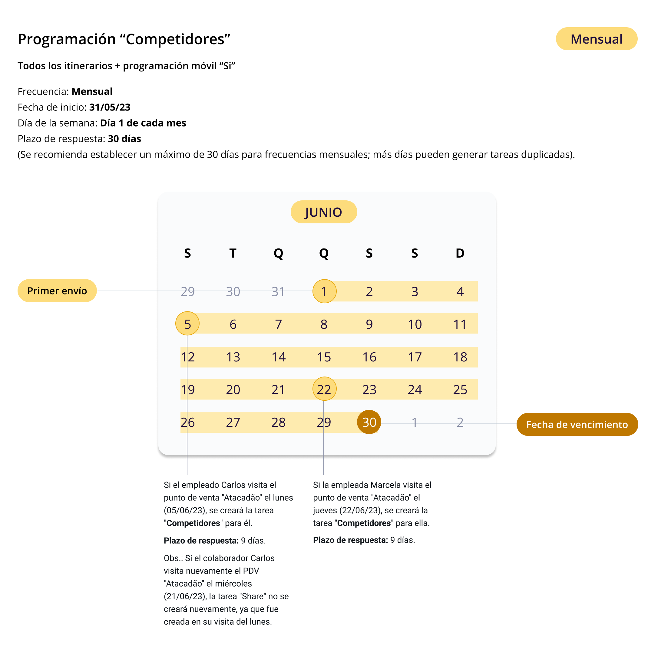 Mensual: Las tareas se crean a partir del check-in, y se generarán una vez al mes por punto de venta y empleado, ejemplo: