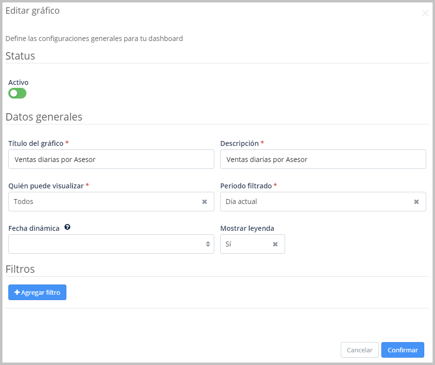 En la ventana emergente Editar gráfico, podrás definir la configuración general de tu nuevo Dashboard, completando los campos: