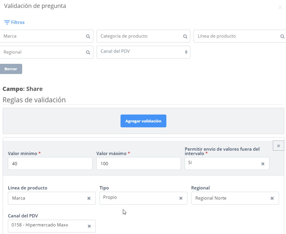 Ya que las validaciones funcionan como las metas, en las reglas de validación debes incluir un valor mínimo como la meta establecida para la categoría o línea de producto. Ahora bien, en el campo valor máximo debes incluir el número 100, que corresponde al 100%