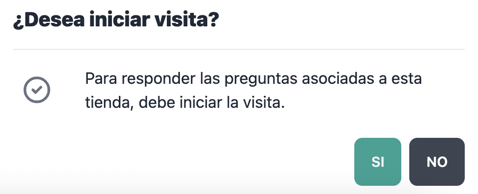 Al seleccionar una tienda desde la lista, el sistema te presentará un mensaje de confirmación preguntando si deseas iniciar la visita. Esto es obligatorio para comenzar a interactuar con la tienda.
