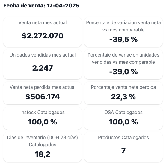 Su objetivo es ofrecer una visión general del estado comercial del PDV, presentando indicadores clave de desempeño. En la parte superior se muestra la fecha de corte sobre la cual se calculan todos los indicadores (en este ejemplo, 17-04-2025). Esto es clave para entender a qué periodo corresponden los datos mostrados.