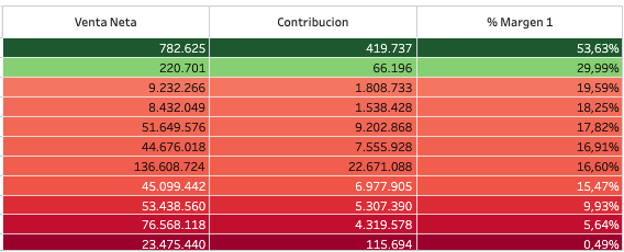 - Rojo indica márgenes bajos o negativos, y puede señalar oportunidades o problemas a revisar.