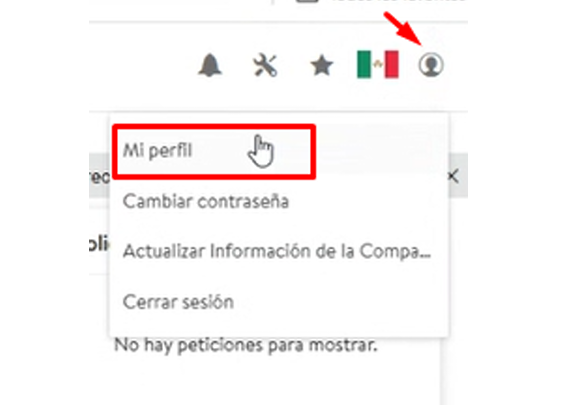 - En el menú desplegable, selecciona Mi Perfil. Verás opciones como: Cambiar contraseña, Actualizar Información de la Compañía, Cerrar sesión.