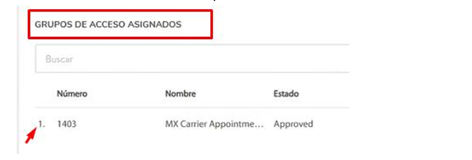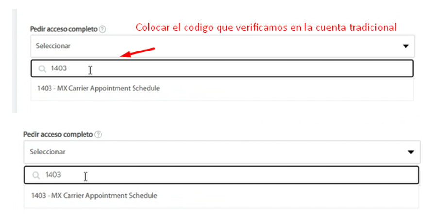 - En el campo Pedir acceso completo, escribe el código identificado en la Sección 3. Ejemplo: busca 1403 y selecciona 1403 — MX Carrier Appointment Schedule.