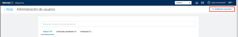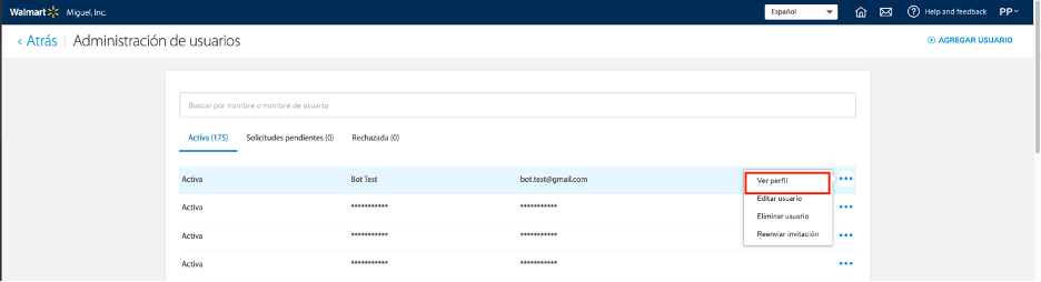- En la lista de Administración de usuarios, localiza al usuario de la cuenta Walmart que no es BOT.
