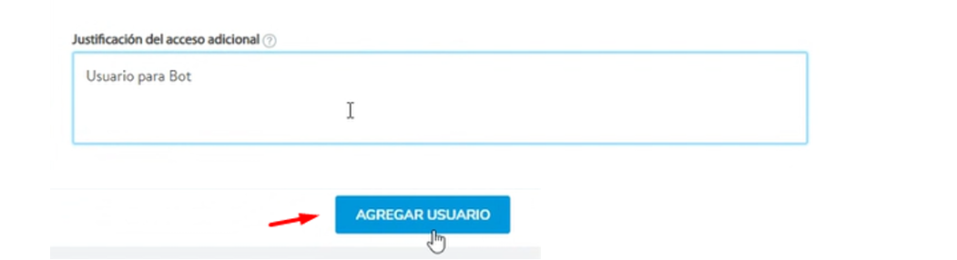 - En el campo Justificación del acceso adicional, escribe: "Usuario para Bot" u otra descripción que identifique el propósito.