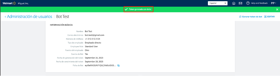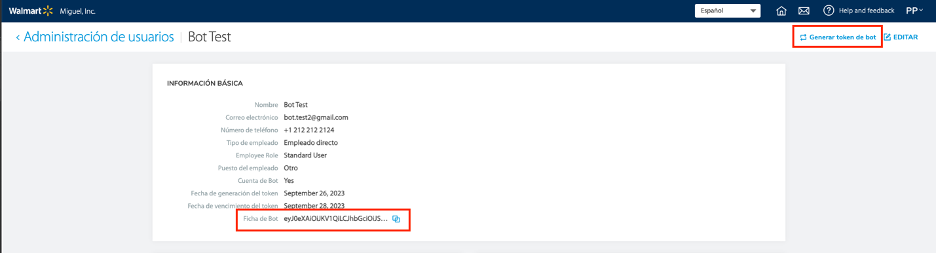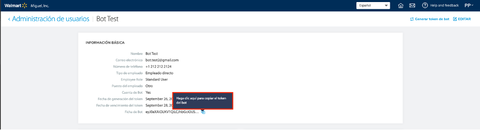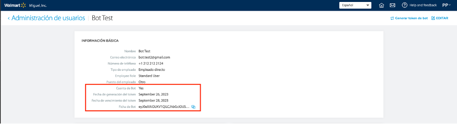 - Desde el perfil del usuario BOT, revisa la Fecha de vencimiento del token.
