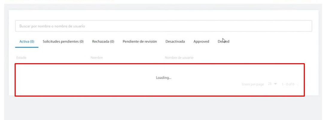 - Se cargarán todos los usuarios creados bajo esta cuenta administrativa. Verás pestañas de filtro: Activo, Solicitudes pendientes, Rechazada, Pendiente de revisión, Desactivada, Approved, Deleted.