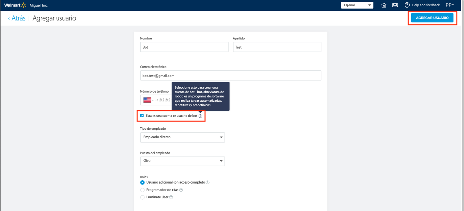 - Cuando busques un BOT en la lista de usuarios, búscalo por correo electrónico, no solo por nombre, para evitar problemas de paginación.