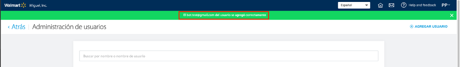 - Haz clic en AGREGAR USUARIO (esquina superior derecha). Aparecerá un banner de confirmación.