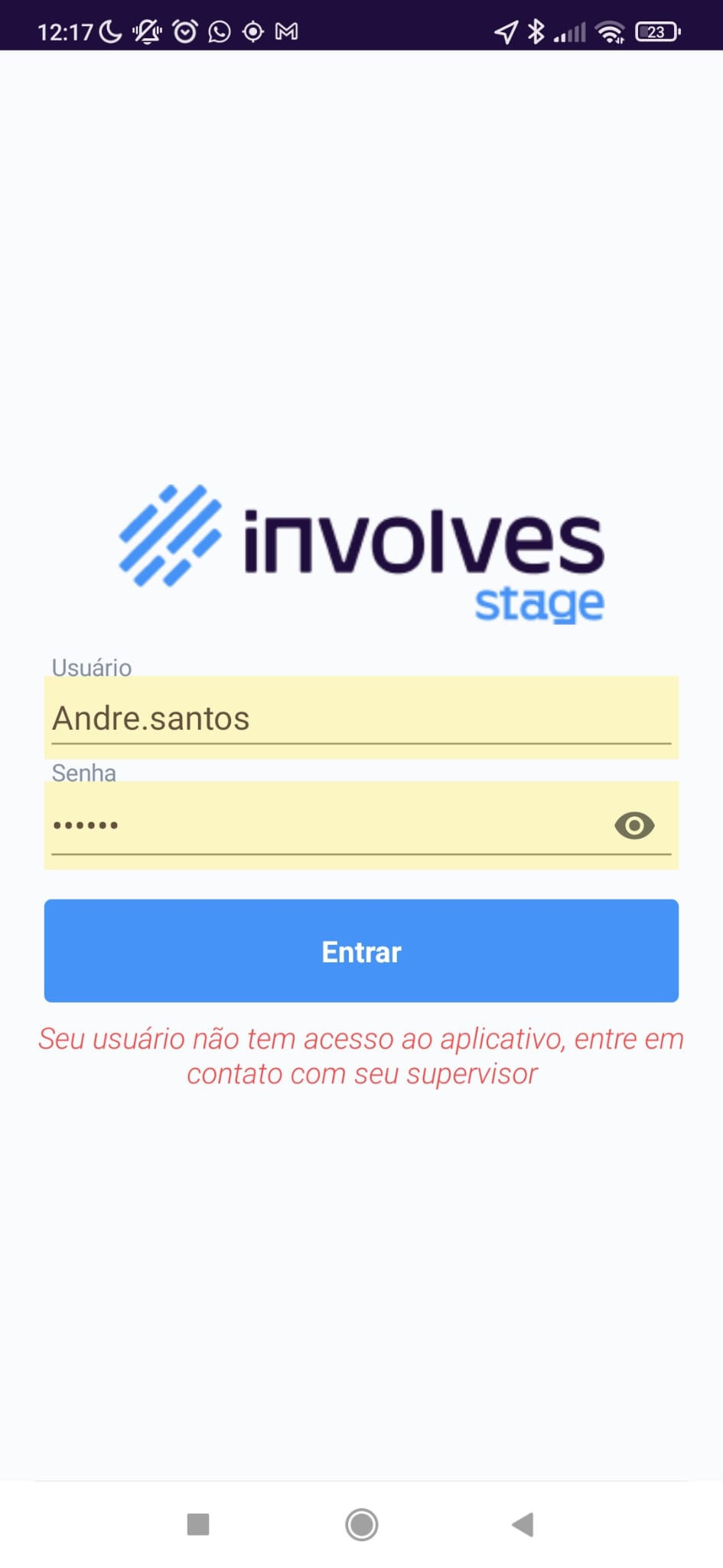 Quando ao acessar o aplicativo aparece a mensagem de erro: o nome de usuário ou senha estão incorretos, tente novamente. O processo para resolver é simples, mas somente um supervisor com acesso ao Involves Stage Web poderá ajudar.