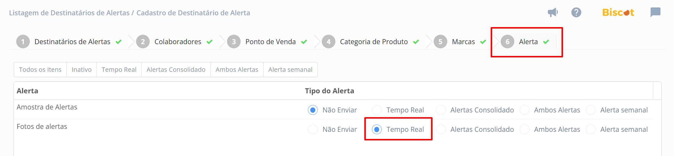- Na configuração do destinatário do alerta, é necessário que o Tipo do Alerta seja Tempo Real.