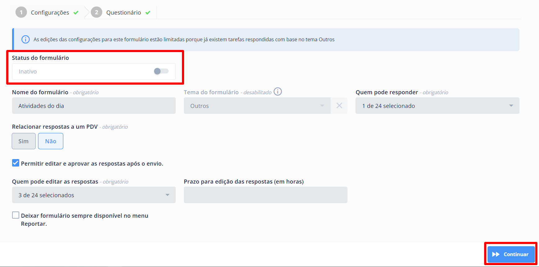 Caso seja necessário consultar as respostas, ative o formulário, realize a consulta e, se necessário, inative-o novamente.