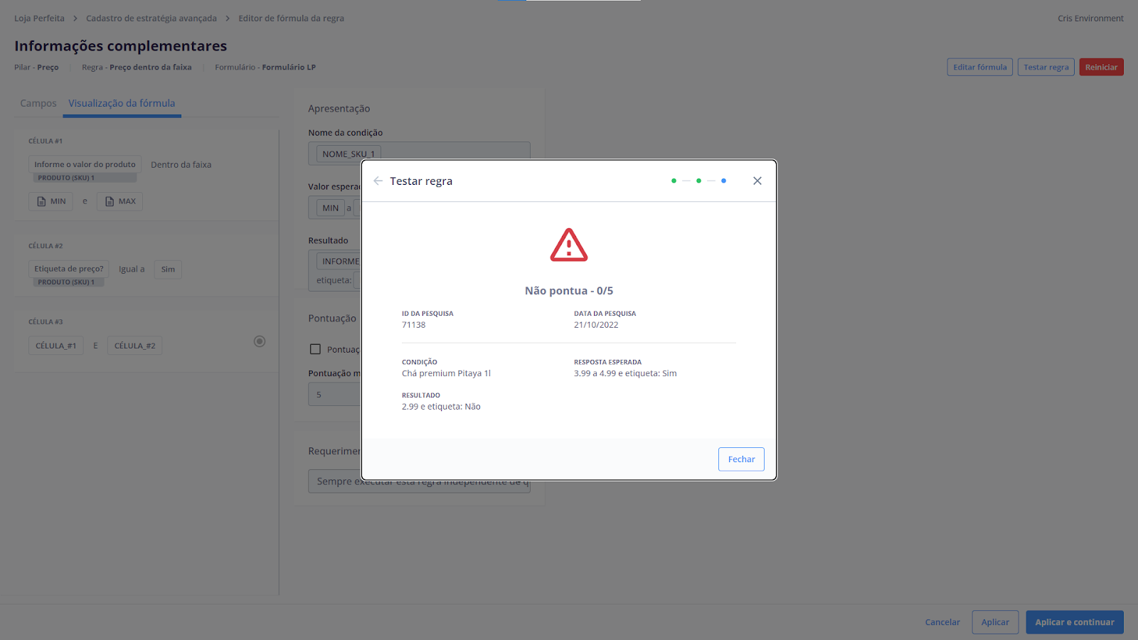 Uma vez terminada a configuração dos parâmetros, é importante testar se a lógica da regra está adequada. Esta etapa simula se a regra pontuando na prática, o testador pega os dados de uma pesquisa real e os campos de CSV preenchidos e processa a regra para ver o resultado.