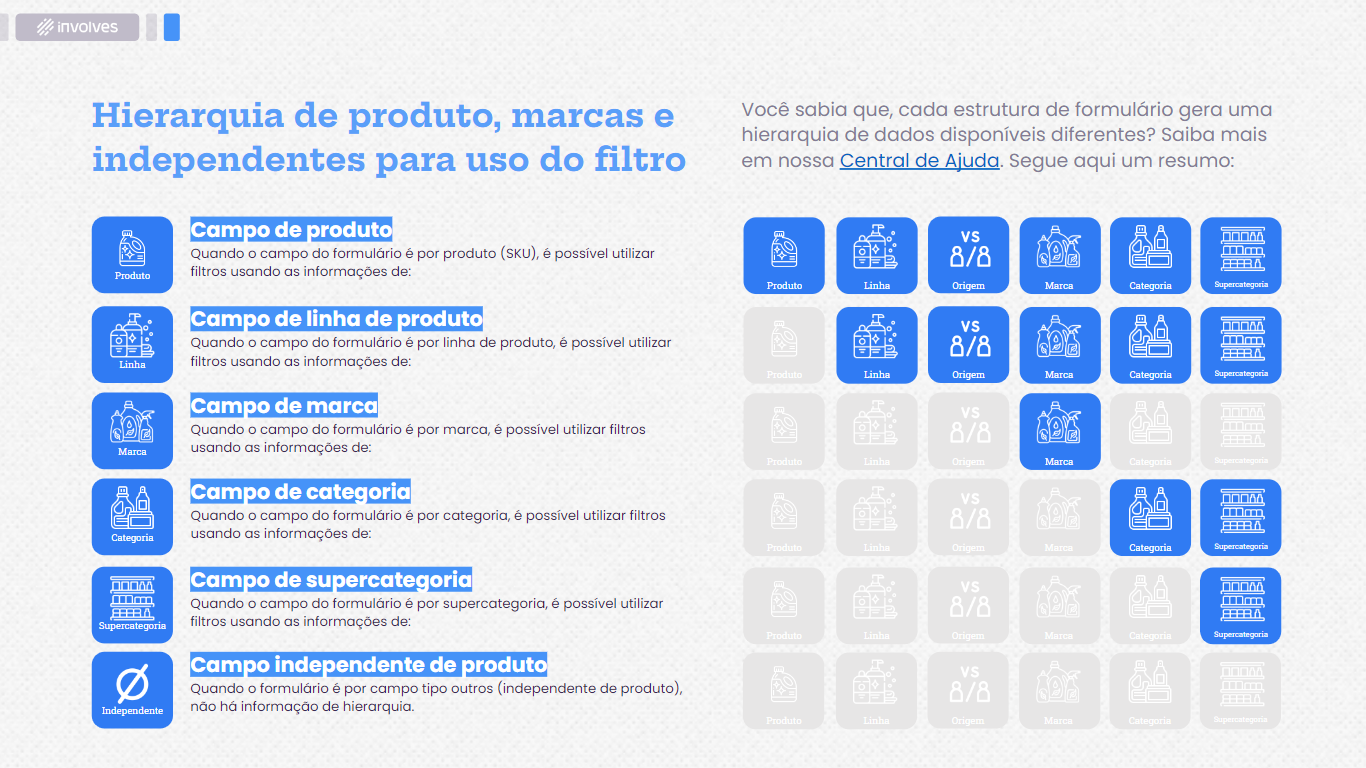 Aqui vale uma dica muito importante. Cada estrutura de formulário gera uma hierarquia de dados disponíveis diferentes, logo, é importante identificar se o filtro que você tenta fazer possui dados disponíveis para serem filtrados. Segue aqui um resumo: