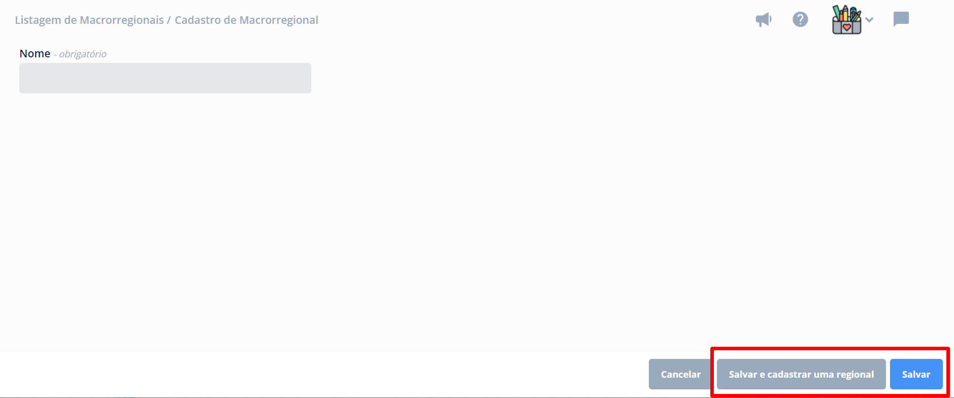 - Preencha o campo Nome com o nome da macrorregional de acordo com sua operação.