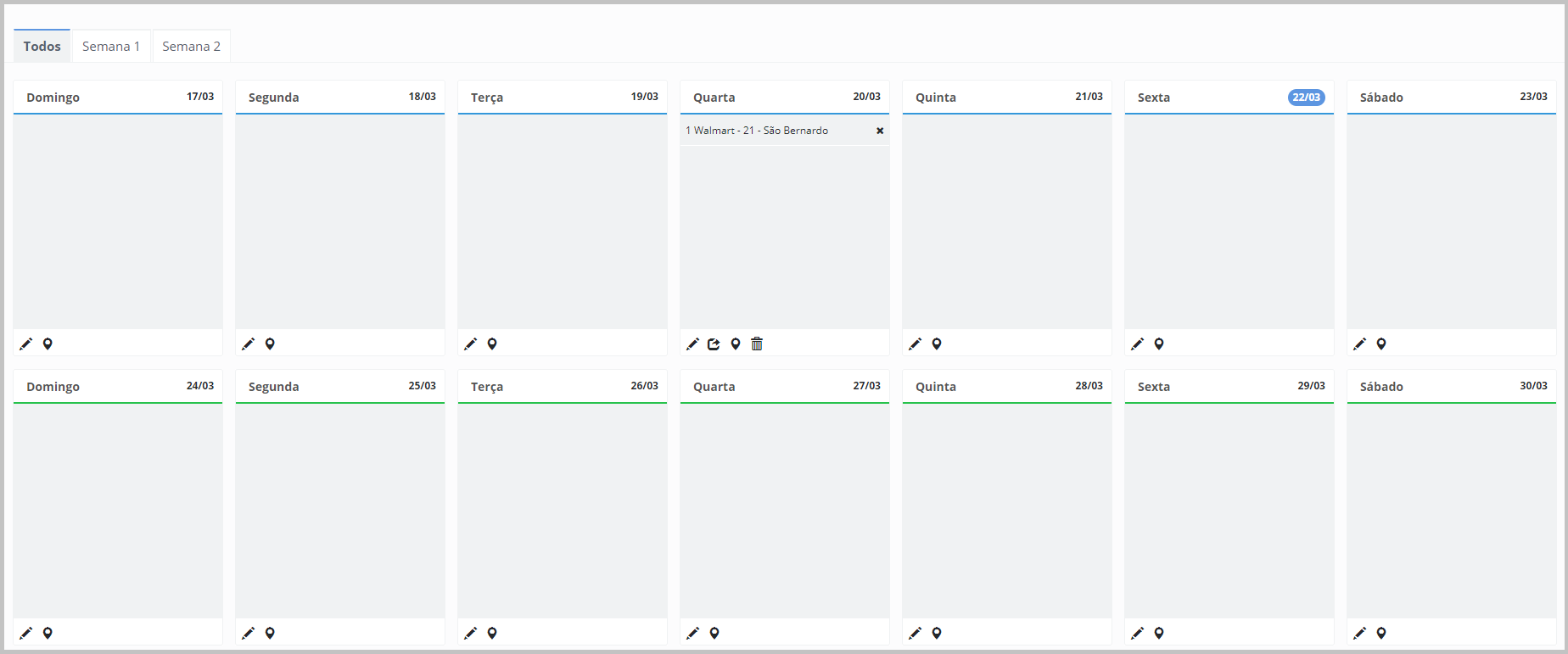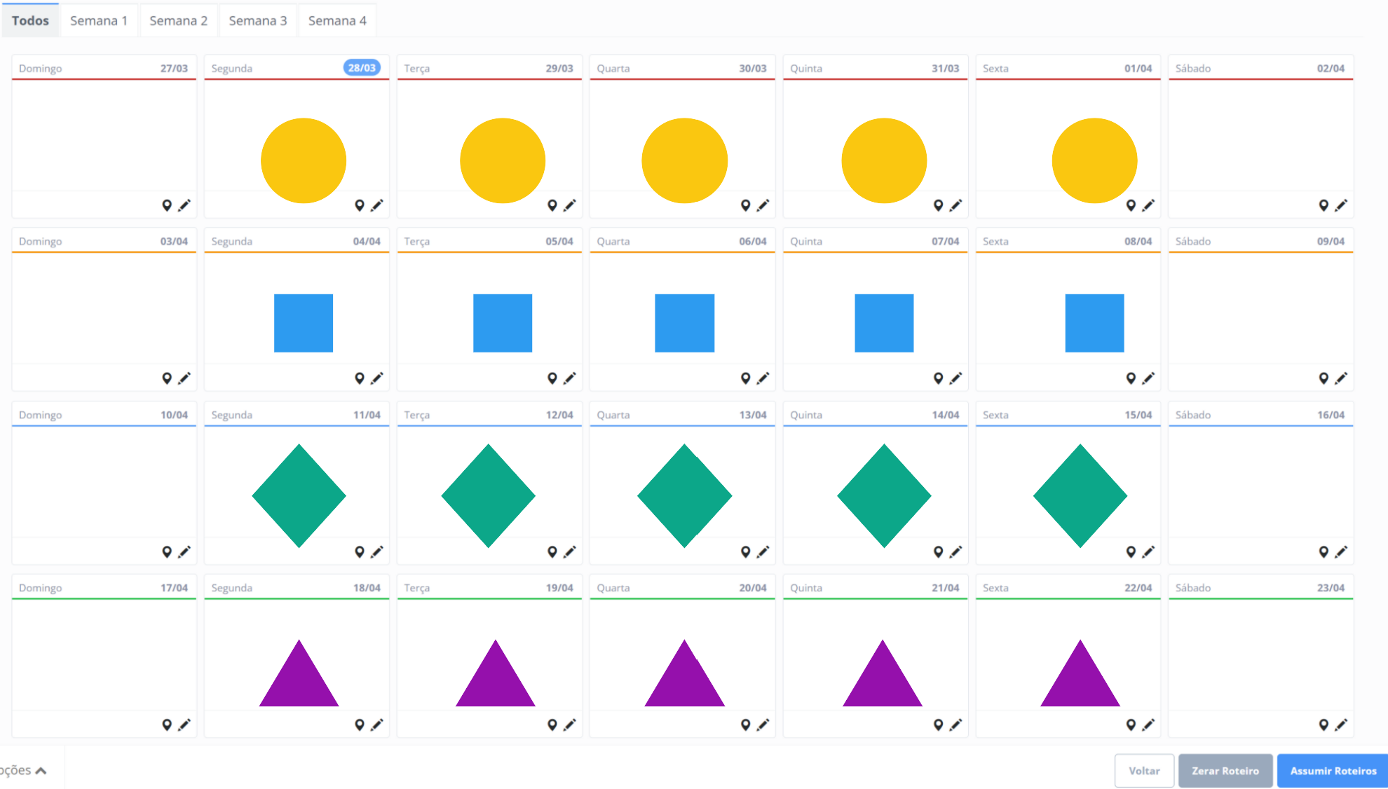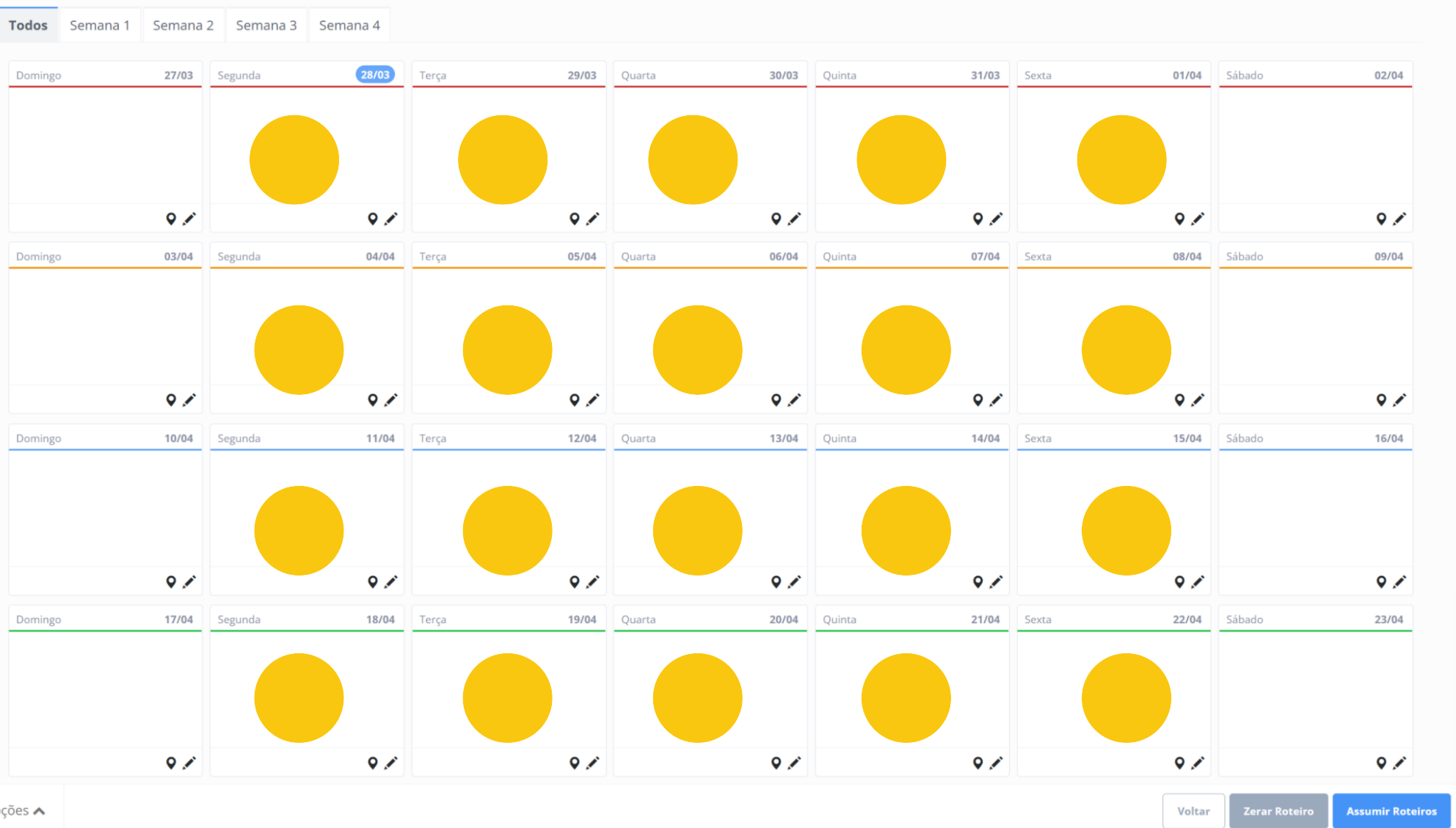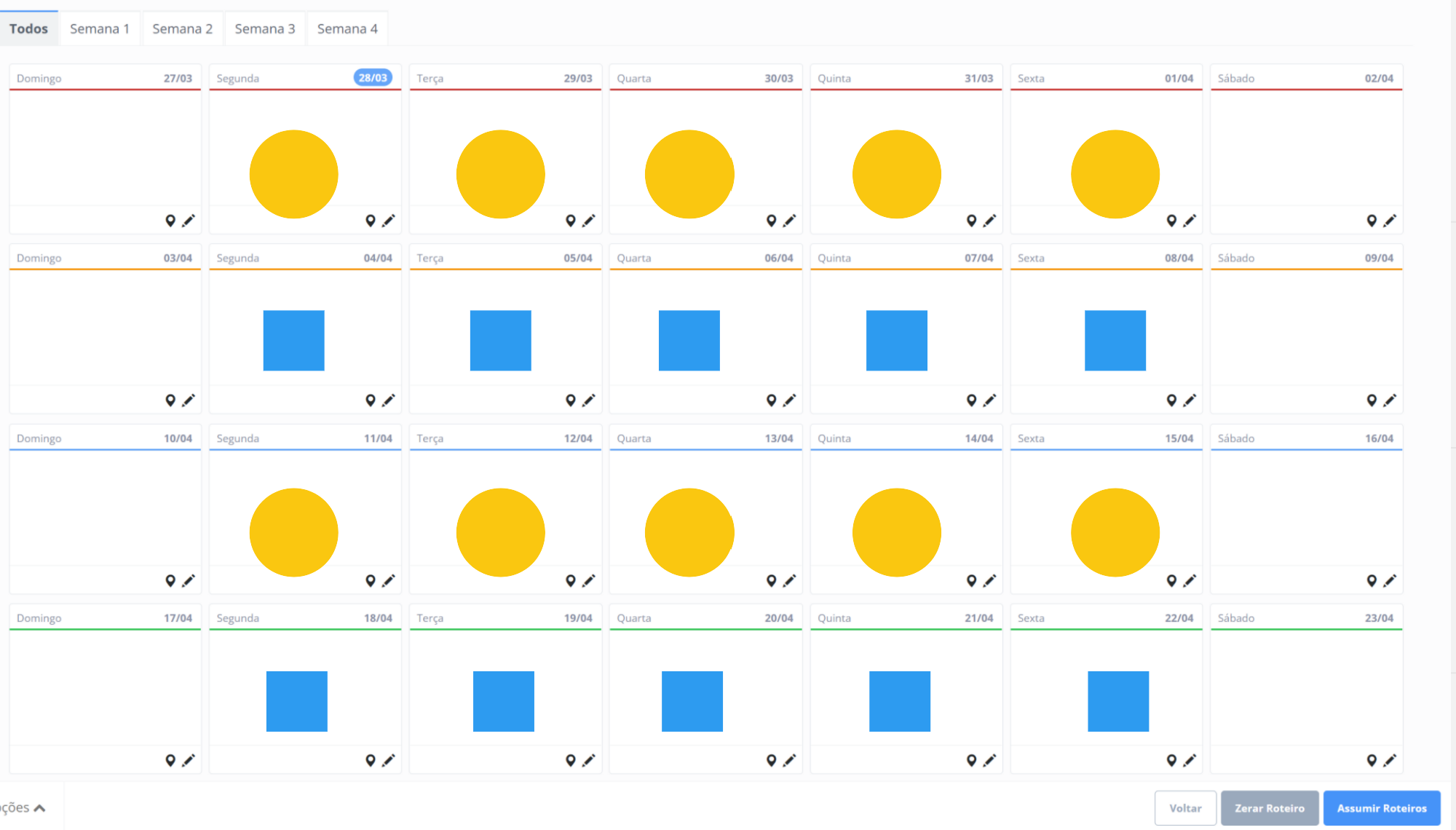 O cadastro do roteiro ocorre dia a dia, em campos parecidos como um calendário. É possível visualizar todos os campos na mesma tela ou então separá-los por semanas, clicando nas abas com o número da semana. As semanas são apresentadas em ciclos, com cores diferentes e a identificação da data atual.