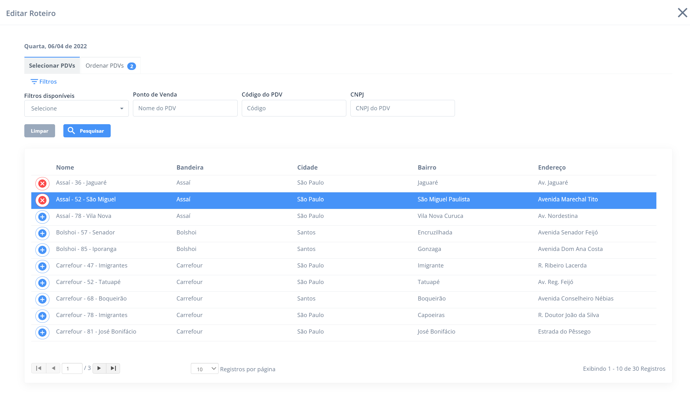 A inclusão dos pontos de venda nos roteiros pode ser feita de duas formas: em lista, selecionando os PDVs pelo nome cadastrado no sistema, ou então por mapa, selecionando os PDVs por meio de sua geolocalização. Os pontos de venda disponíveis para inclusão são os que fazem parte da mesma regional do colaborador. Além disso, a roteirização por mapa depende que tantos os colaboradores quanto os pontos de venda estejam georreferenciados no sistema.