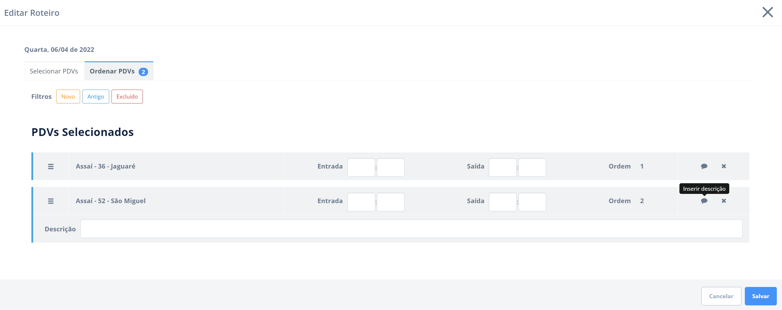 - Em Ordenar PDVs você pode alterar a ordem da lista e pode incluir o horário de entrada e saída
