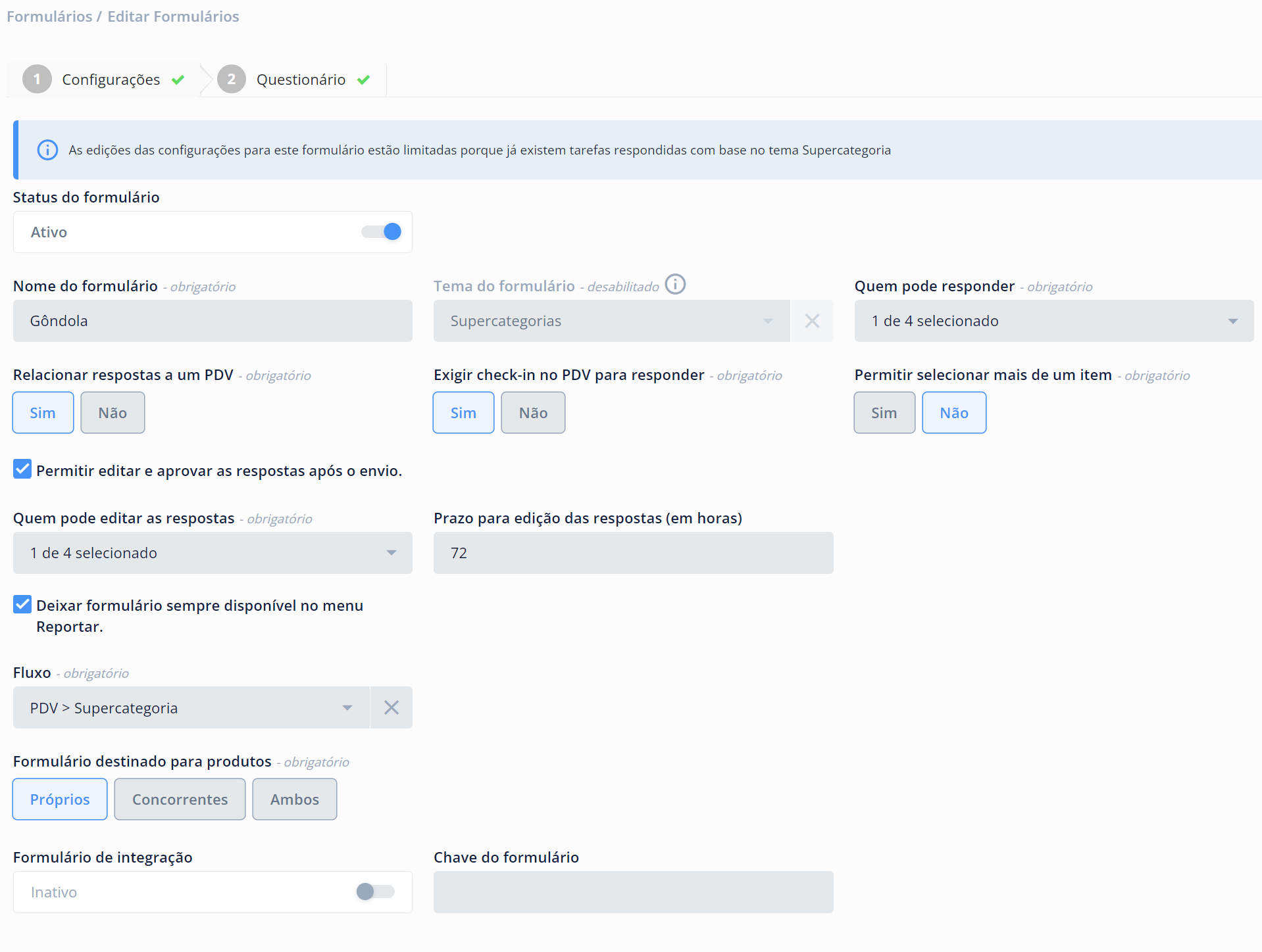 O próximo passo é associar o planograma cadastrado a um de seus formulários de pesquisa já em uso ou criando um novo. Você pode utilizar o planograma associado a formulários utilizado em tarefas de execução no ponto de venda, exposição e reposição, auditoria de gôndolas etc.