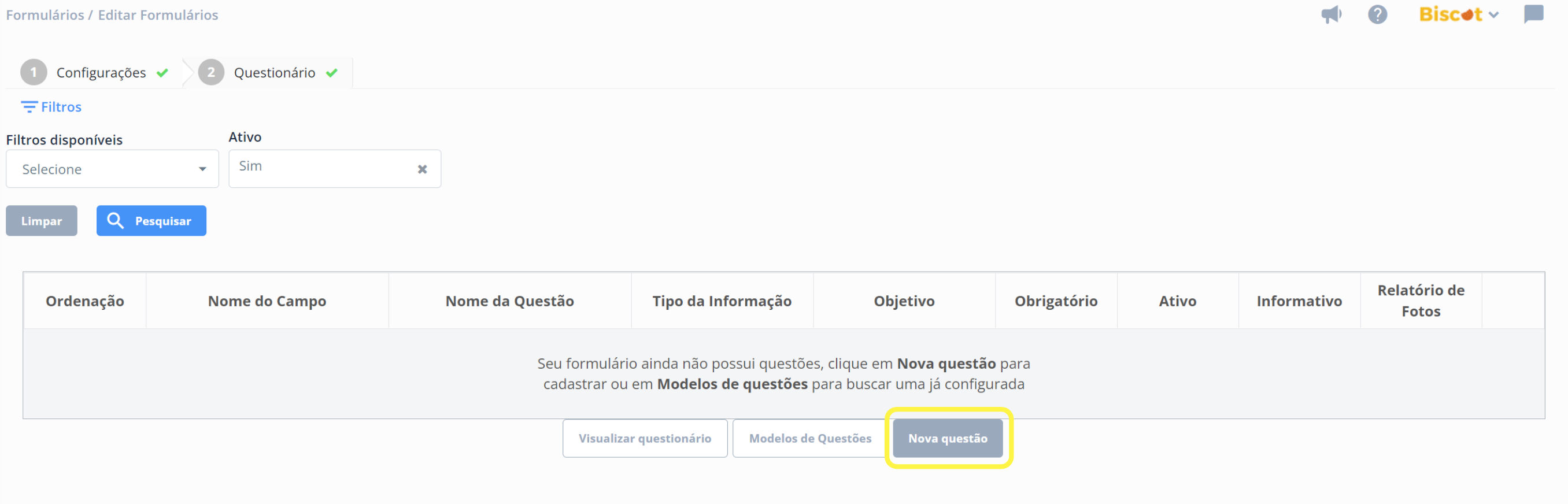 Já na aba Questionário, clique no botão Nova questão para inserir um novo campo.