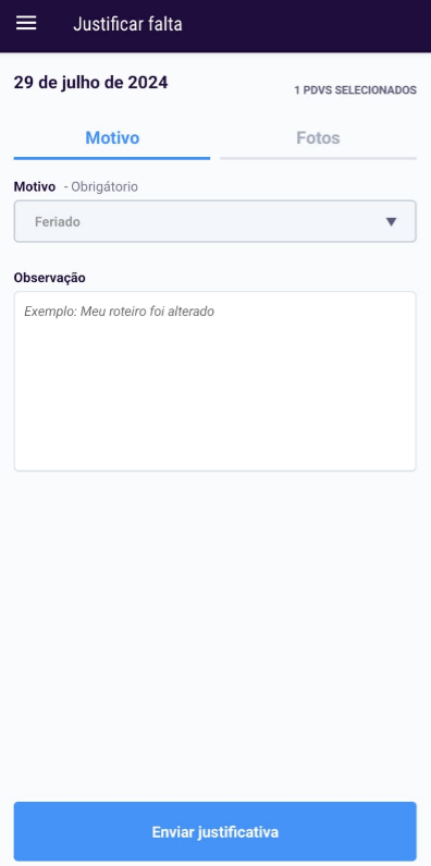 O objetivo diário da equipe de campo é cumprir todas as visitas programadas aos pontos de venda do seu roteiro. Sempre que não for possível visitar todos os pontos de vendas agendados no seu roteiros do dia e precisar justificar a ausência ou mesmo falta em algum dia de trabalho, acesse a função Justificar falta.