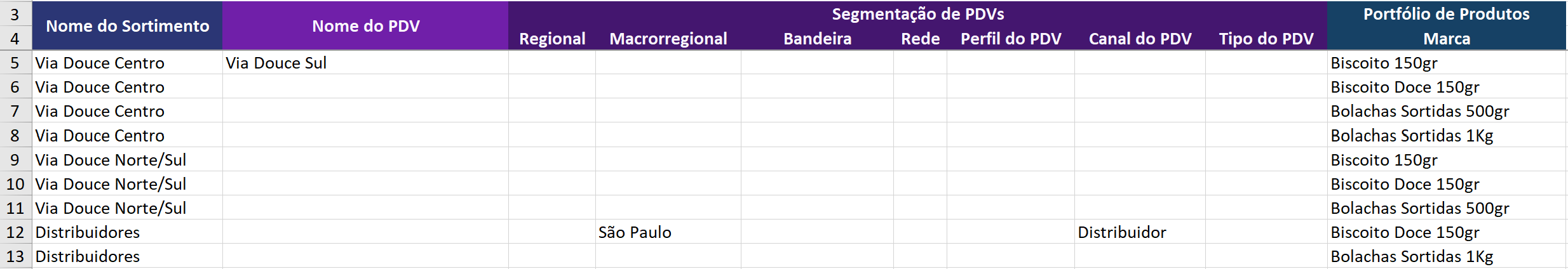 Caso mais de um PDV tenha o mesmo mix de produtos, adicione-os em linhas diferentes dentro do mesmo sortimento. Veja o exemplo: