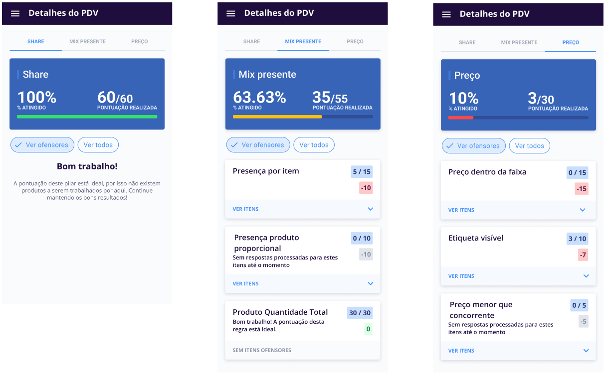 Ao clicar em cada pilar, o usuário tem acesso às informações do que deixou de pontuar. O usuário pode saber até mesmo qual produto perdeu mais pontos por estar em ruptura, por exemplo.