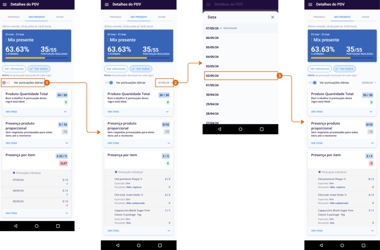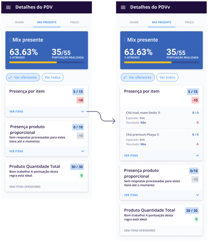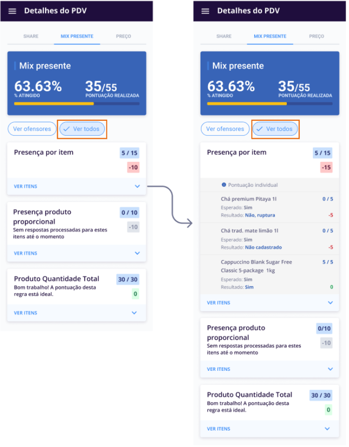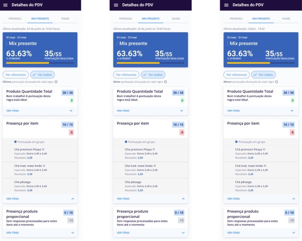 Em Ver itens sem pontuação o usuário observa qual a resposta você inseriu na pesquisa sobre o produto e qual era a esperada para pontuar na estratégia, e identifica qual produto priorizar na sua próxima visita.