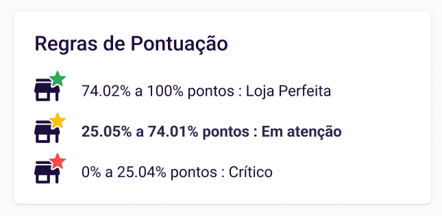 O card de Regras de pontuação exibe o que define se uma loja está em estado Crítico, Em atenção ou é uma Loja Perfeita.