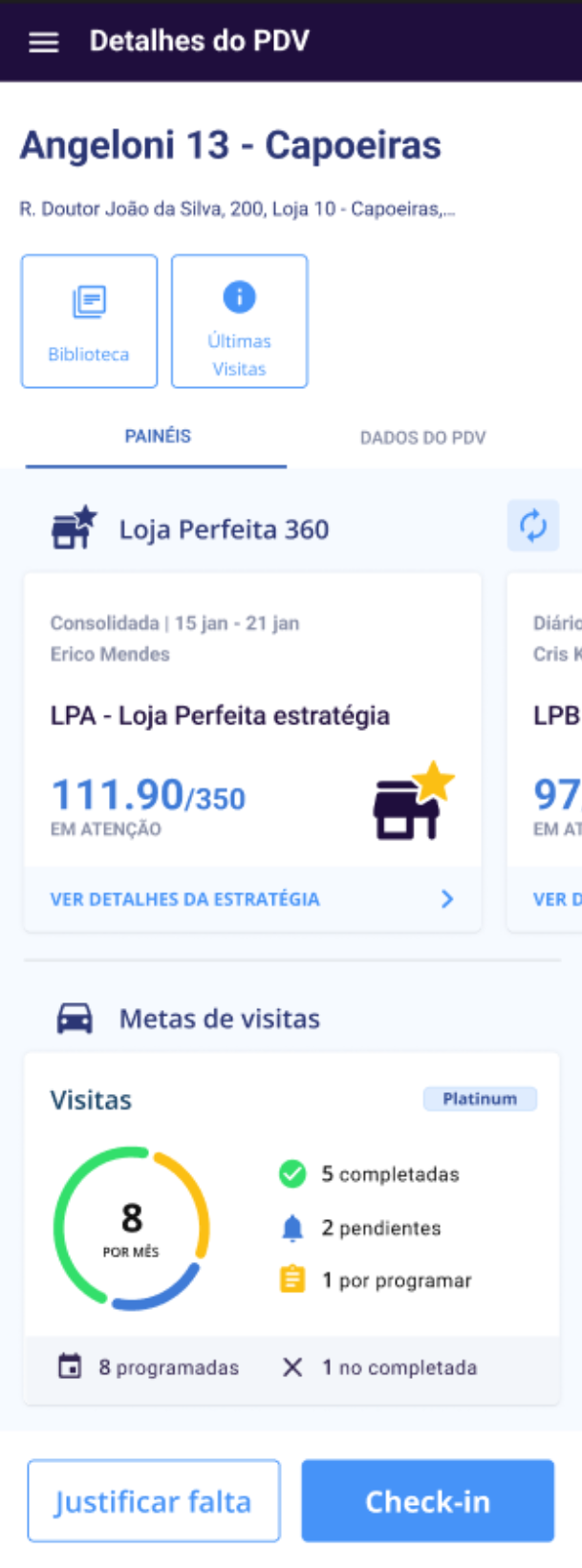 Para acessar os dados da Loja Perfeita acesse seu Roteiro e selecione um ponto de venda. Logo depois, na aba Painéis você encontra as estratégias da qual o PDV faz parte, a pontuação de cada uma e outros detalhes que ajudam a entender melhor a execução realizada.