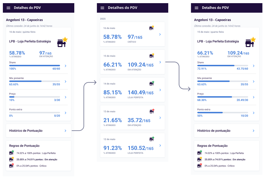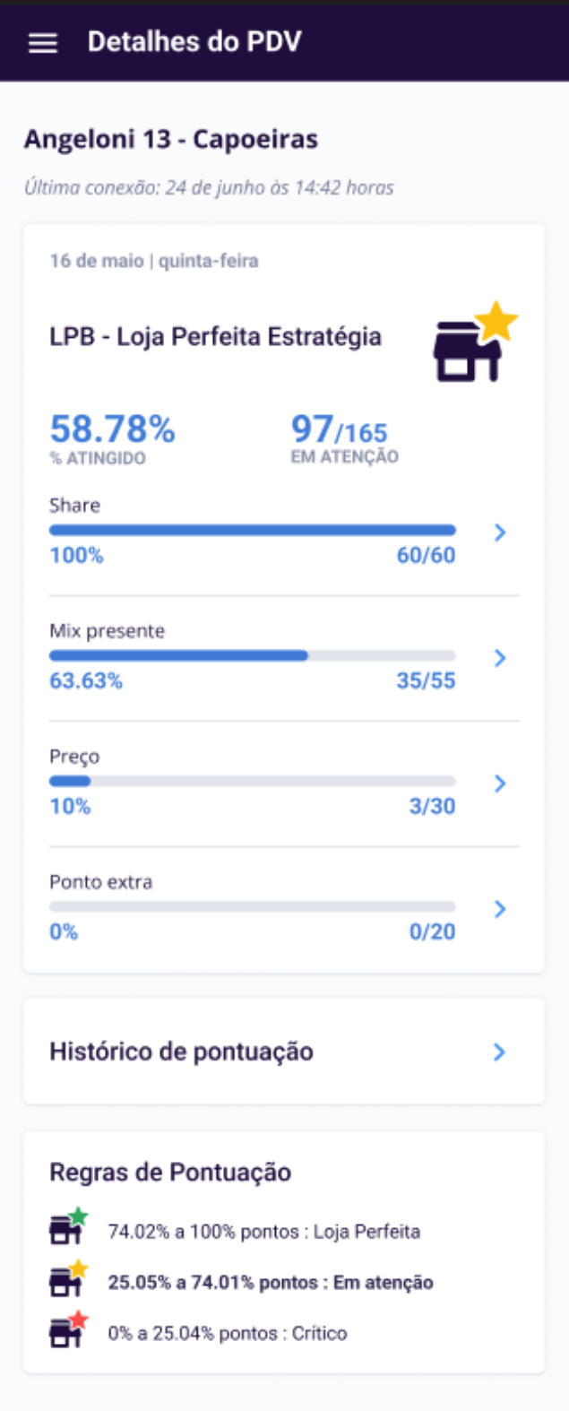 O usuário também pode acompanhar a pontuação realizada pelo ponto de venda e o percentual atingido da meta para ele. Em Ver histórico de pontuação, o usuário também navega pelas últimas 30 execuções feitas e acompanha a evolução da pontuação do PDV.