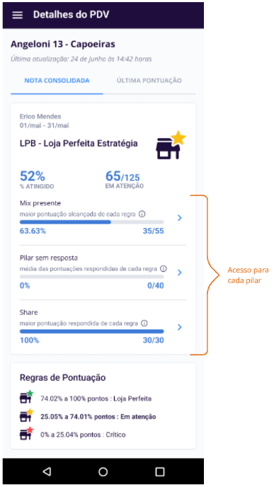 Em Ver detalhes da estratégia você tem acesso a mais informações sobre a situação do ponto de venda, com dados como o detalhamento da performance de cada pilar e o histórico de pontuação, além de visualizar as regras de pontuações. Veja abaixo como é o detalhamento de cada tipo de pilar.