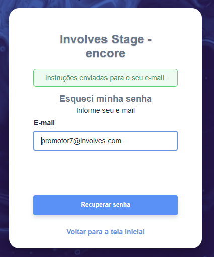 2 - Informe o seu e-mail cadastrado no Involves Stage e clique em Recupera Senha.