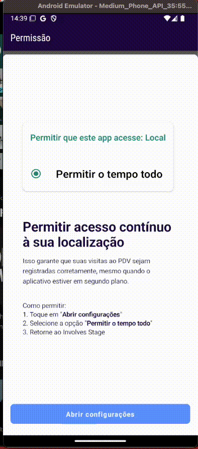 IMPORTANTE: Ao ativar a permissão na web, o app do Involves Stage vai exigir que o colaborador altere a configuração de permissão de localização do aparelho para: Permitir o tempo todo.
