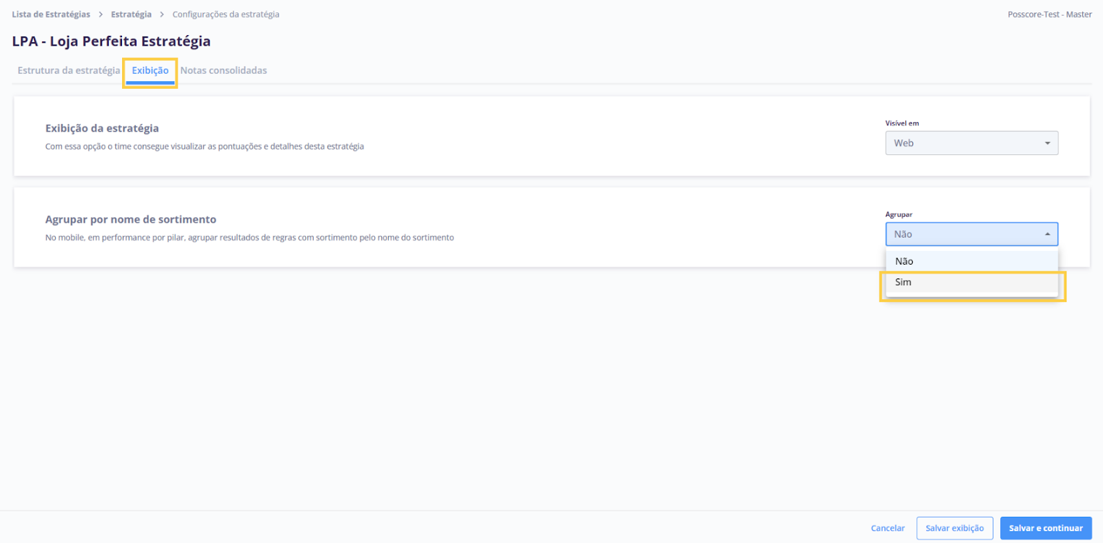 - Selecione a aba Exibição, procure a opção Agrupar por nome de sortimento e modifique a opção Agrupar para Sim.