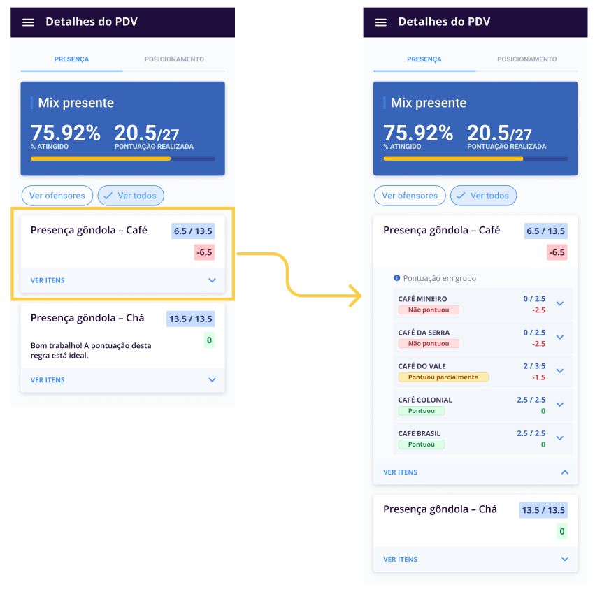 No dashboard da Loja Perfeita no Stage, vá até Pontuações para visualizar a lista de sortimentos disponíveis e suas respectivas pontuações. Ao clicar em cada sortimento, você poderá detalhar as condições que foram ou não atendida dentro dos mesmos.